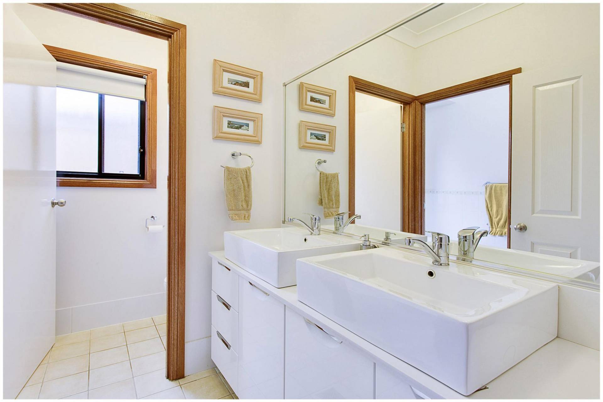 * The highly practical main bathroom is 3way with double vanity and modern Square Ceramic Bench-top sinks.