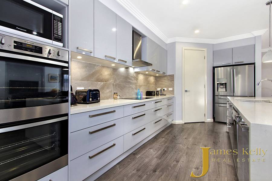 - Enormous designer kitchen with 40mm stone bench tops and quality stainless steel appliances including  double ovens and Bosch dishwasher, soft close drawers and walk-in pantry