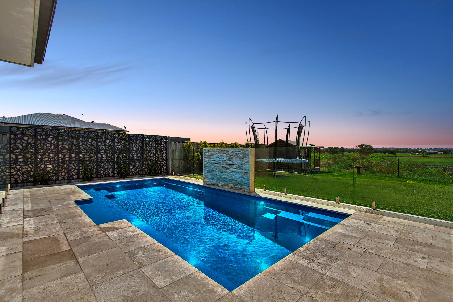 Wide entry foyer flowing into the multiple living rooms including the media/theatre room, formal living room and a north facing outdoor alfresco overlooking  the salt water swimming pool with water fall surrounded by soft touch travertine tiling