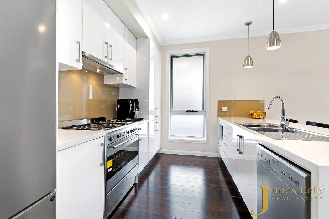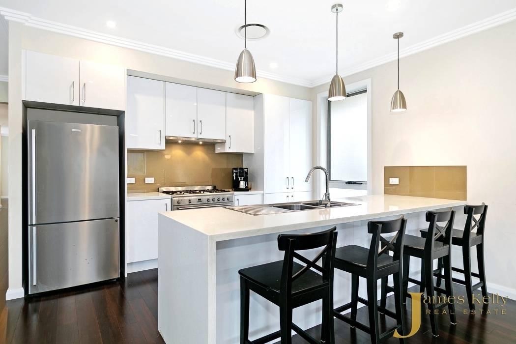 * Gourmet kitchen with 40mm stone benches with waterfall, stainless steel appliances including stand alone gas cooker