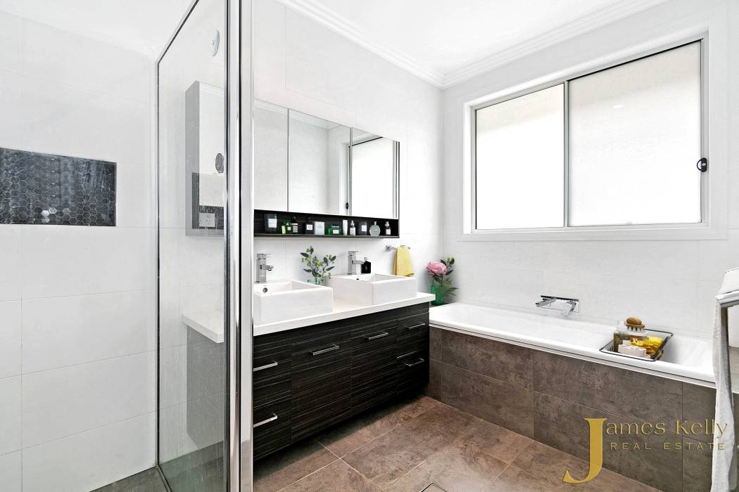 * Fully tiled to ceiling bathrooms with double vanities, stone bench-tops and quality fixtures as well as  semi frameless glass screens and a walk in linen