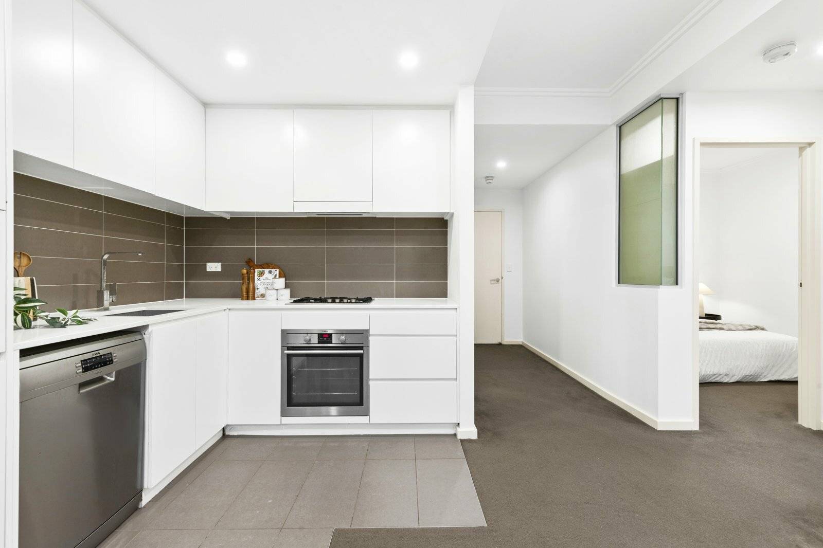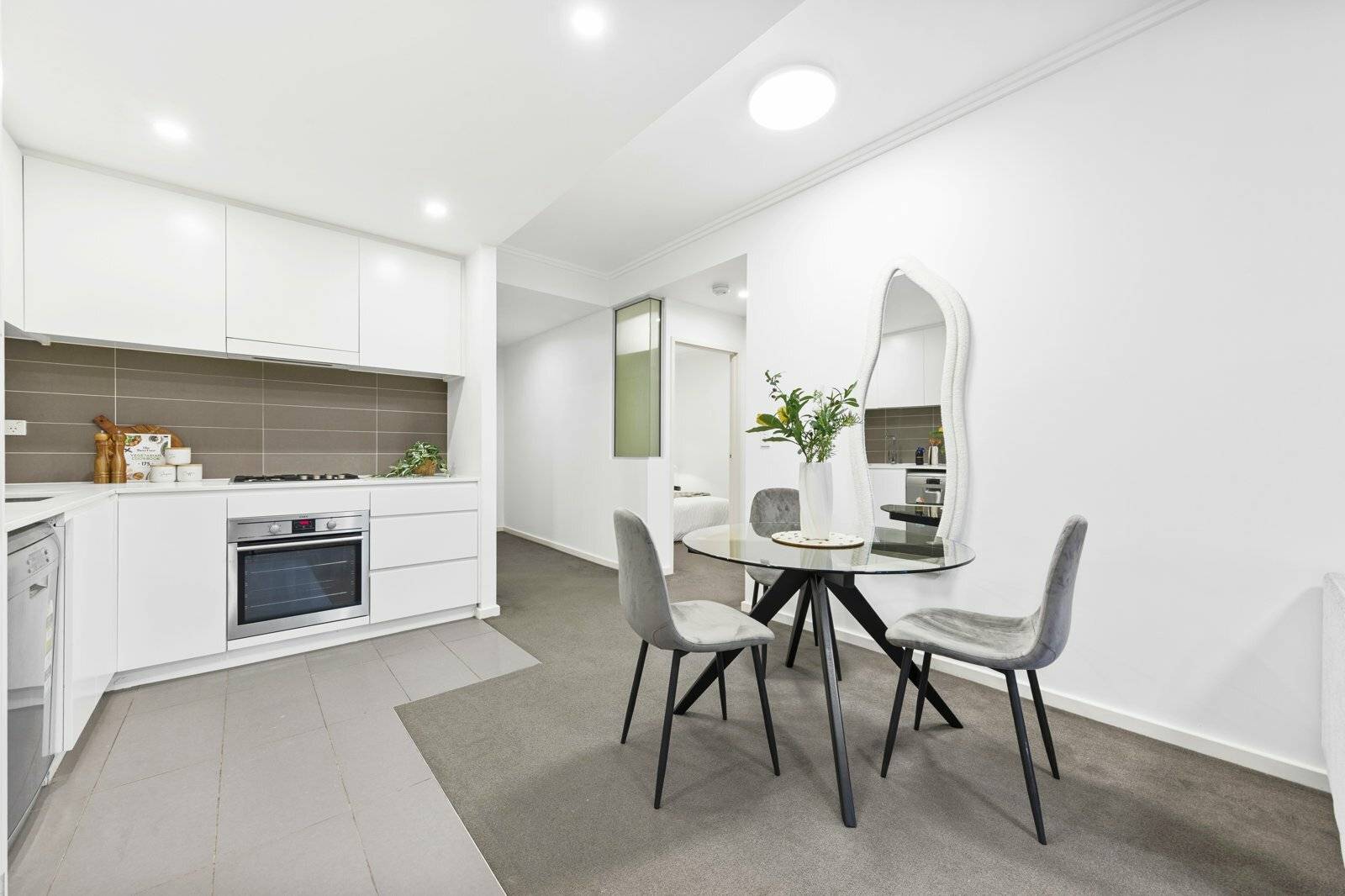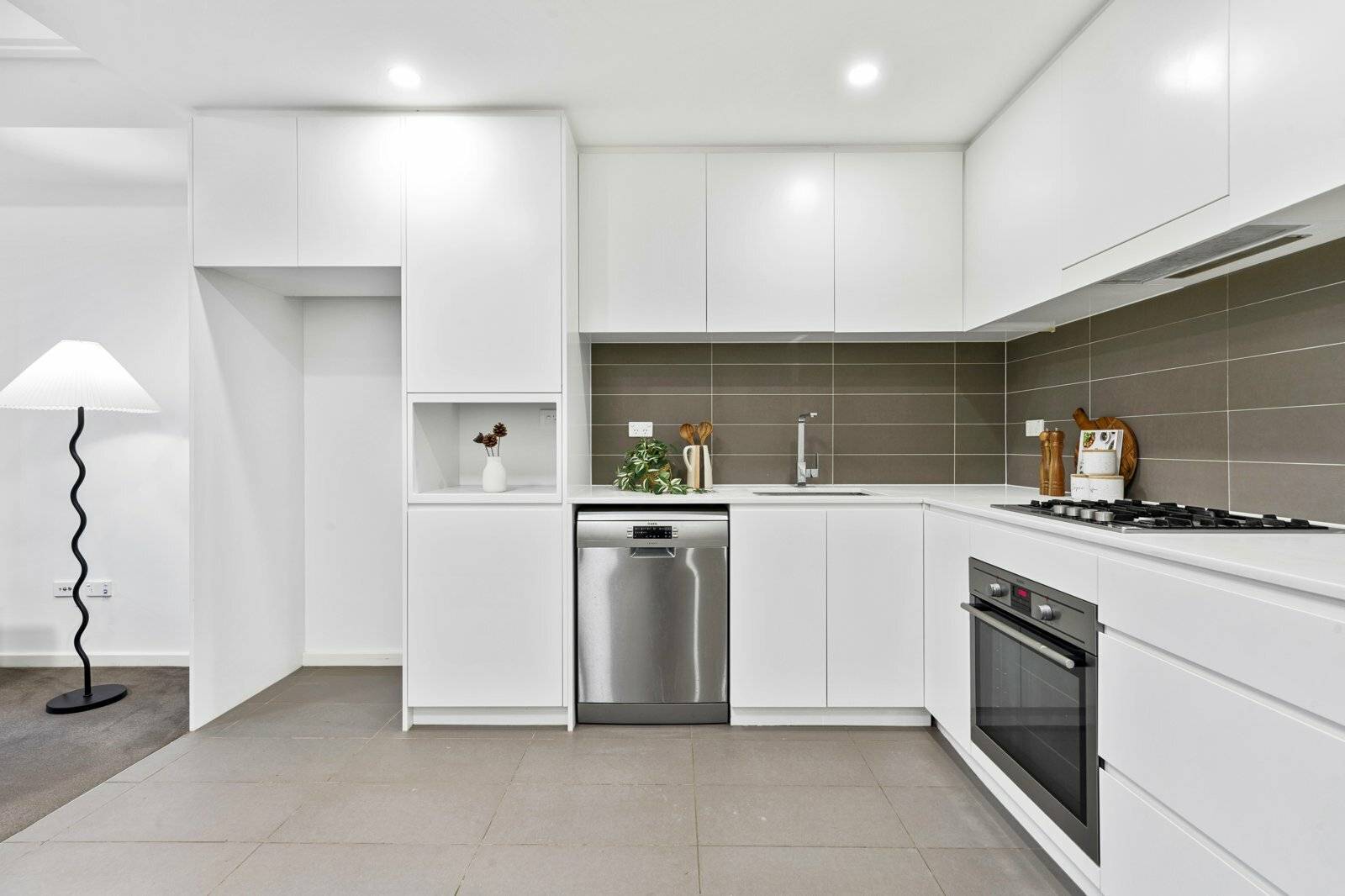 • Modern gas kitchen with SS appliances, stone bench top and finger pull poly cupboards